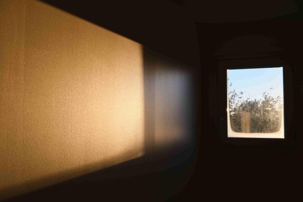 Une lumière vive entre par une petite fenêtre rectangulaire sur la droite, créant un fort contraste avec l'obscurité de la pièce. Un grand carré de lumière naturelle illumine un mur clair à gauche, soulignant sa texture rugueuse.